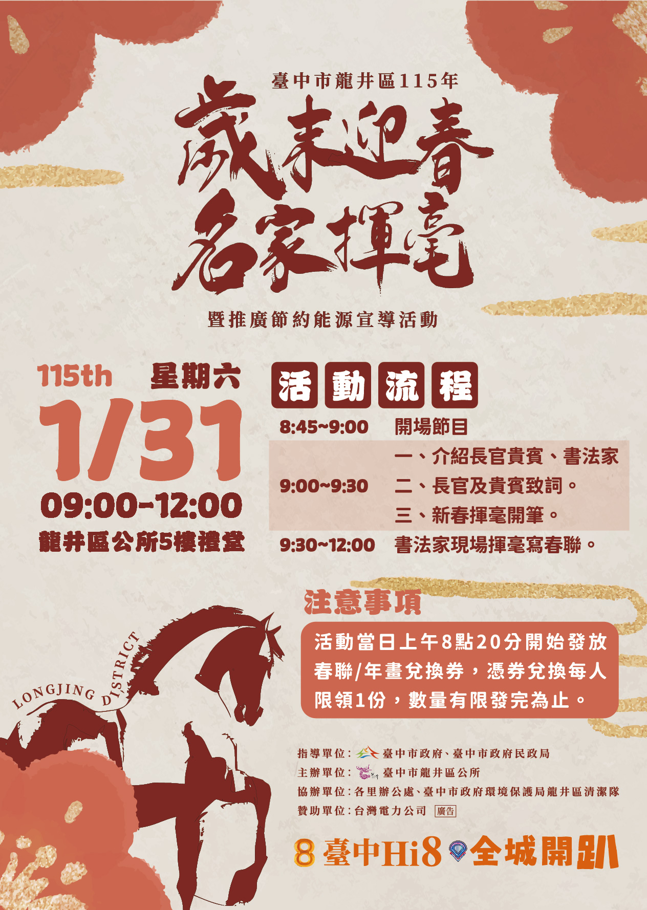 一、 旨揭活動謹訂於115年1月31日(星期六)上午9時至12時 ,於臺中市龍井區公所5樓禮堂舉辦,敬邀蒞臨增添年節喜氣。